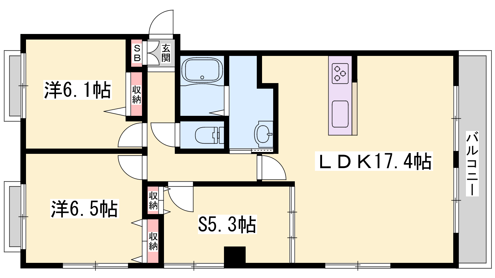 - LDK17.4帖、洋室6.5帖、洋室6.1帖、S5.3帖