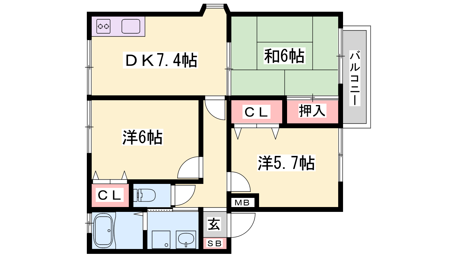 - DK7.4帖、洋室6帖、和室6帖、洋室5.7帖
