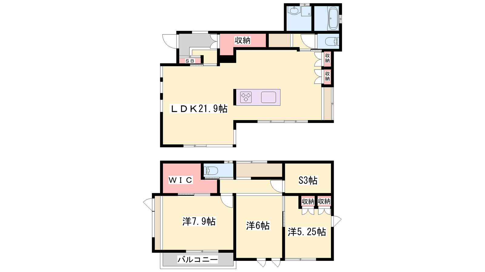 - LDK21.9帖、洋室7.9帖、洋室6帖、洋室5.25帖、S3帖
