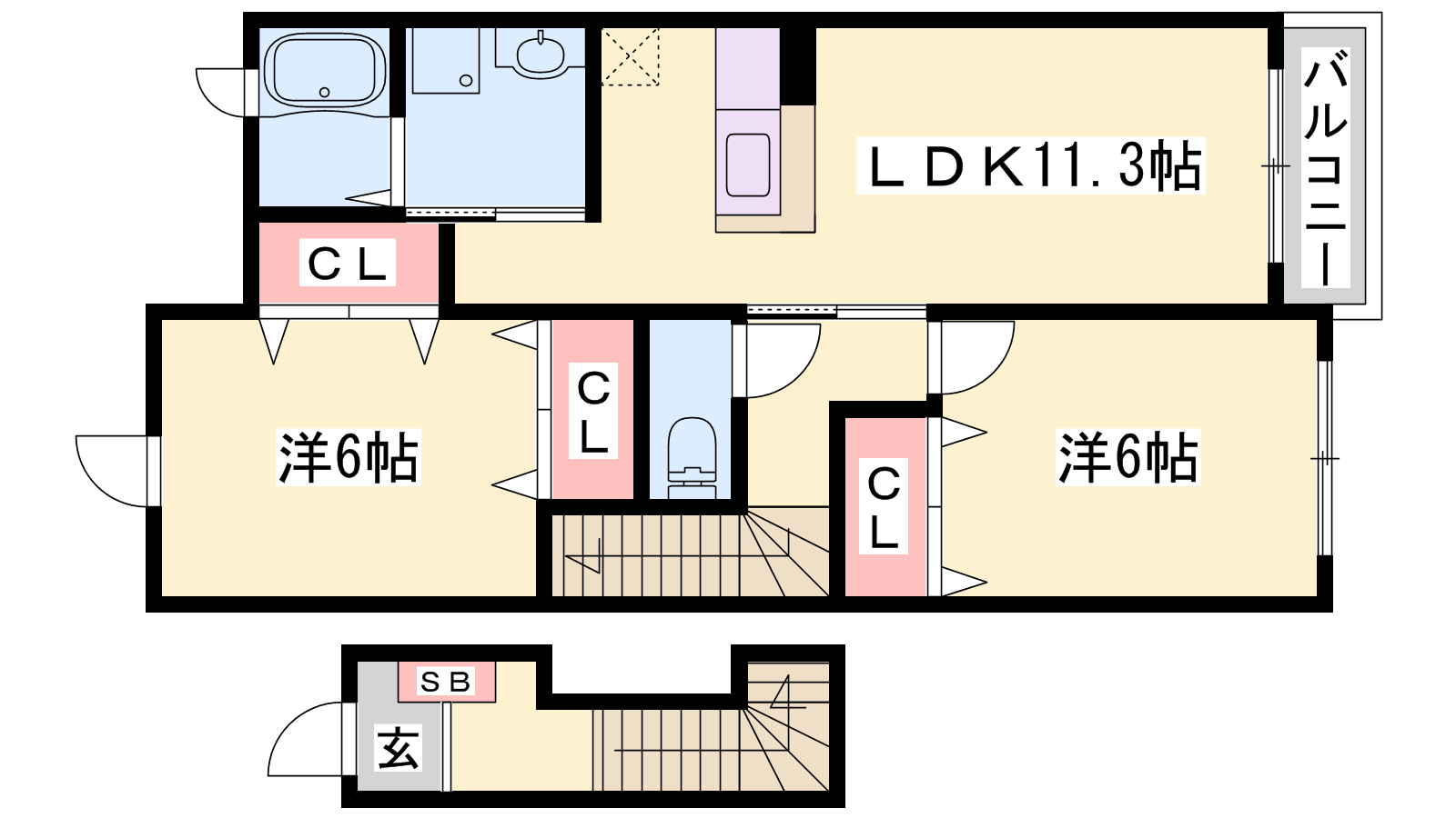 - LDK11.3帖、洋室6帖、洋室6帖