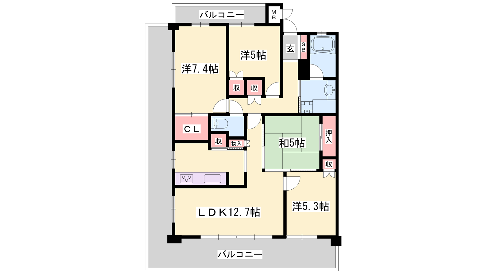 - LDK12.7帖、洋室7.4帖、洋室5.3帖、洋室5帖、和室5帖