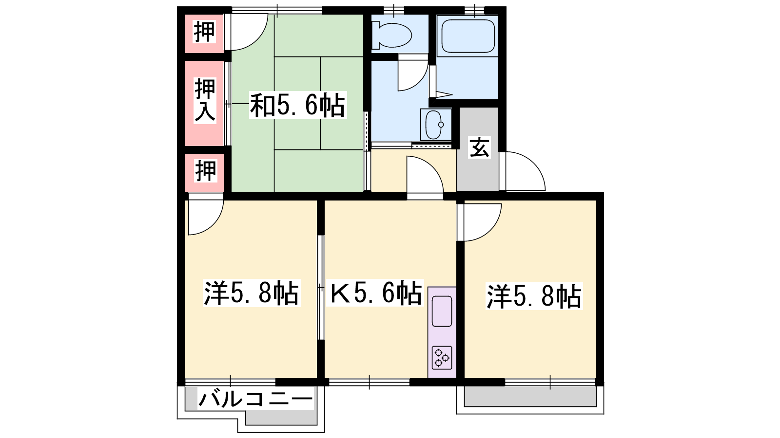 - K5.6帖、洋室5.8帖、洋室5.8帖、和室5.6帖