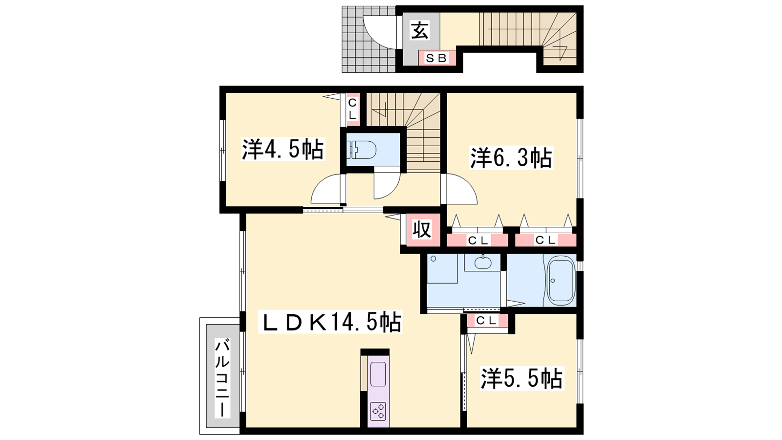 - LDK14.5帖、洋室6.3帖、洋室5.5帖、洋室4.5帖