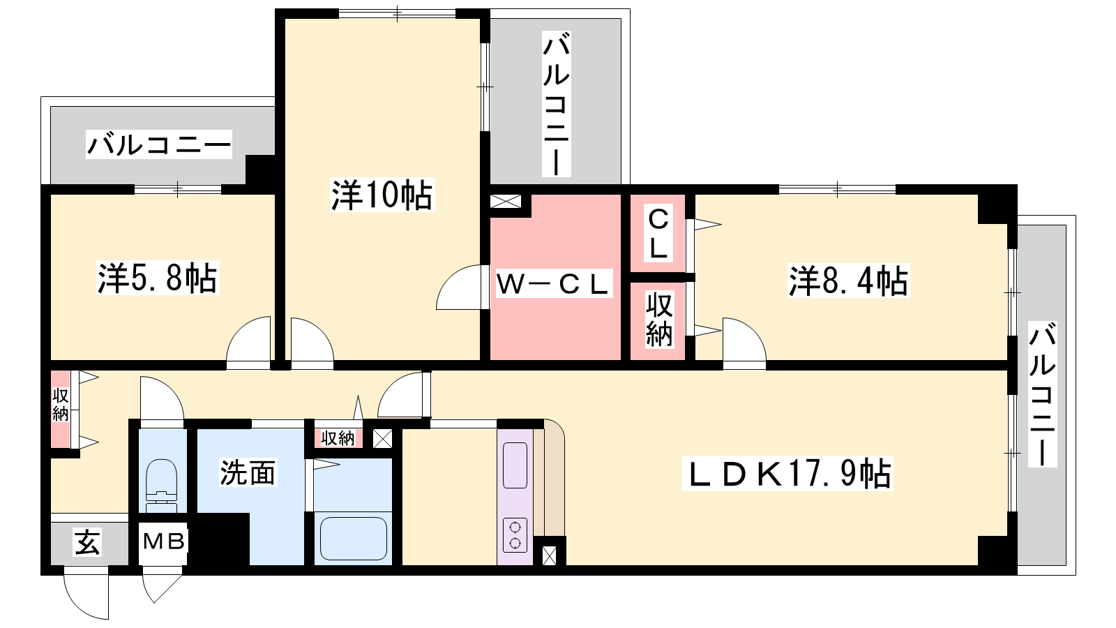 - LDK17.9帖、洋室10帖、洋室8.4帖、洋室5.8帖