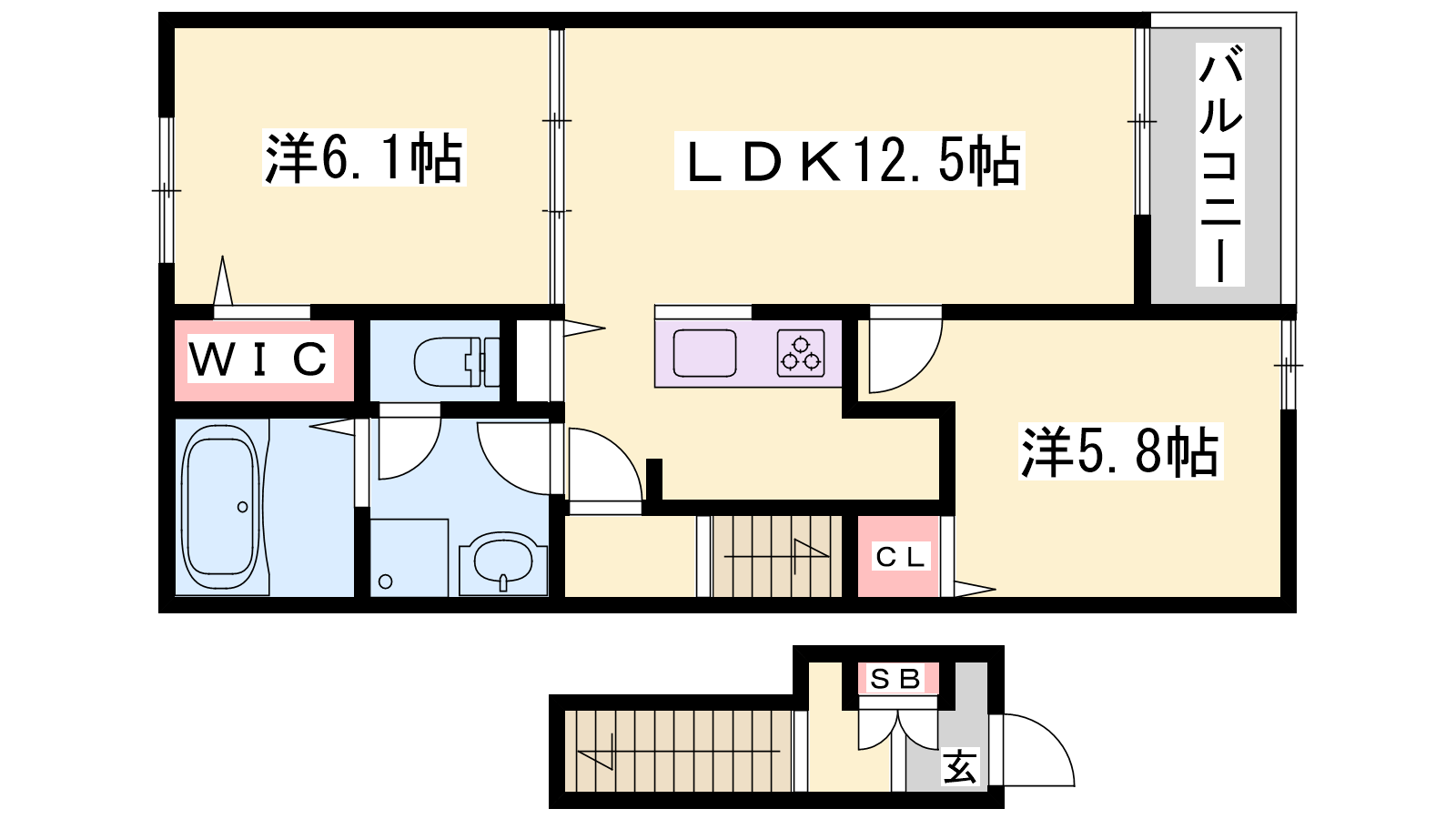 - LDK12.5帖、洋室6.1帖、洋室5.8帖