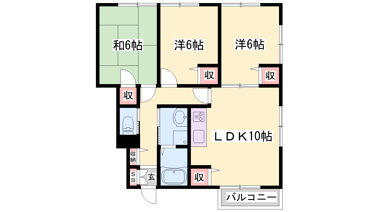 - LDK10帖、洋室6帖、洋室6帖、和室6帖
