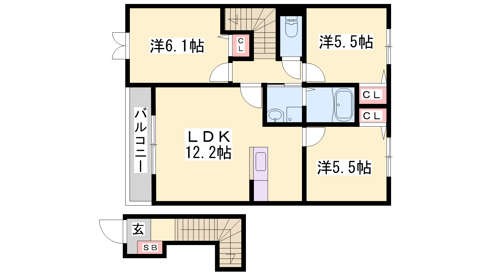 - LDK12.2帖、洋室6.1帖、洋室5.5帖、洋室5.5帖