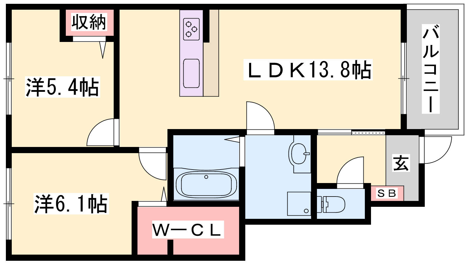 - LDK13.8帖、洋室6.1帖、洋室5.4帖