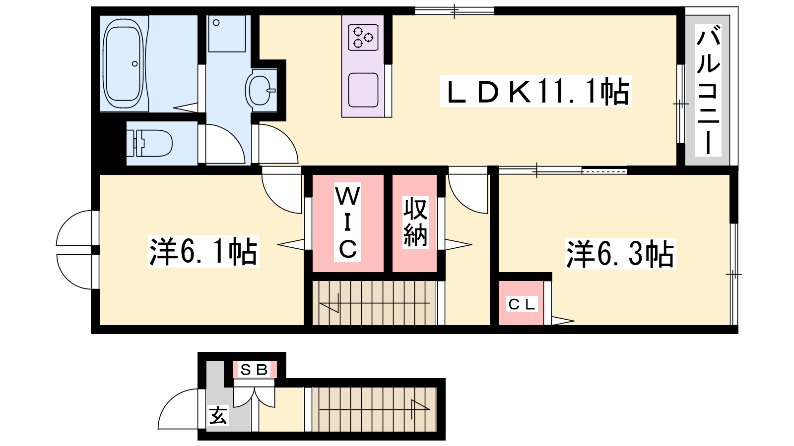 - LDK11.1帖、洋室6.3帖、洋室6.1帖