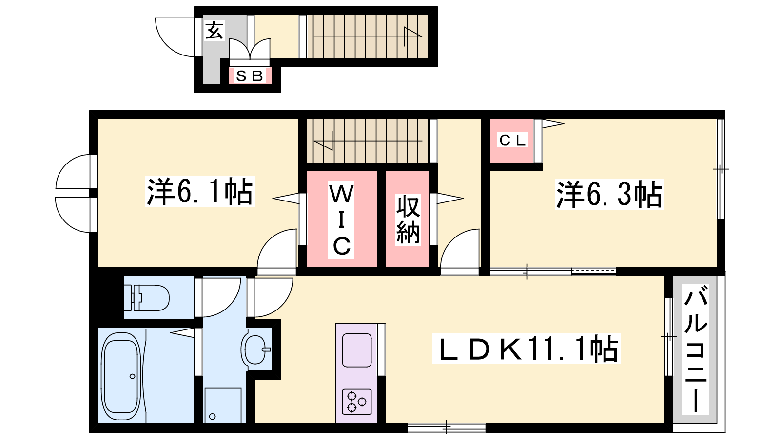 - LDK11.1帖、洋室6.3帖、洋室6.1帖