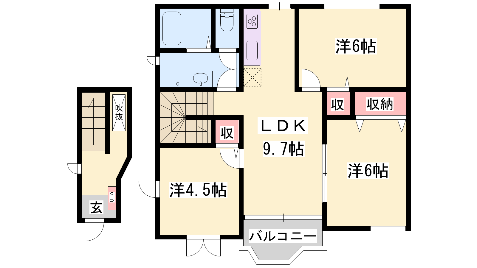- LDK9.7帖、洋室6帖、洋室6帖、洋室4.5帖