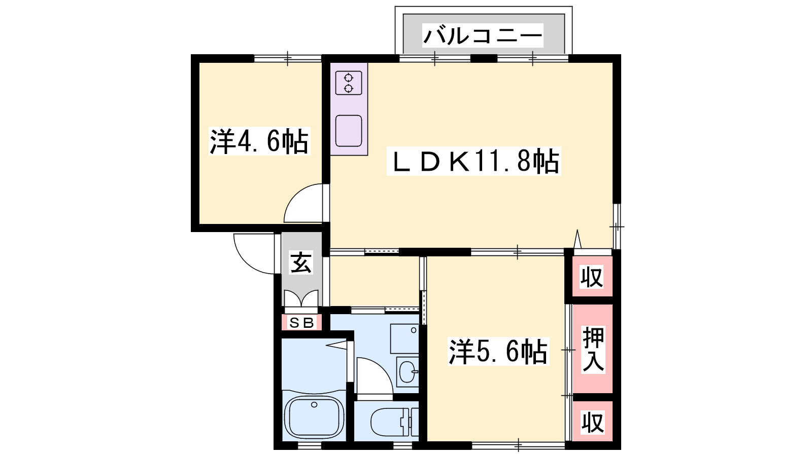 - LDK11.8帖、洋室4.6帖、洋室5.6帖