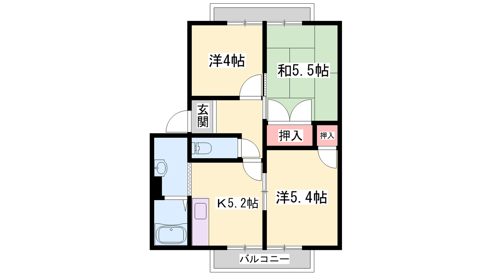 - K5.2帖、洋室5.4帖、洋室4帖、和室5.5帖