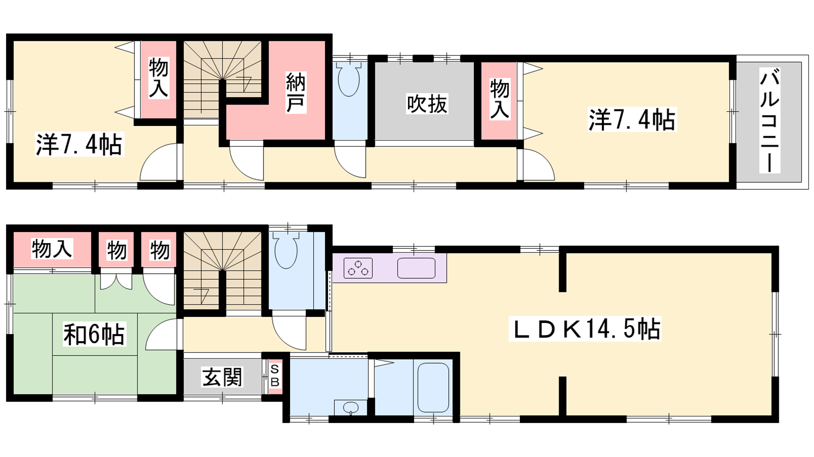 - LDK14.5帖、洋室7.4帖、洋室7.4帖、和室6帖、S2.9帖