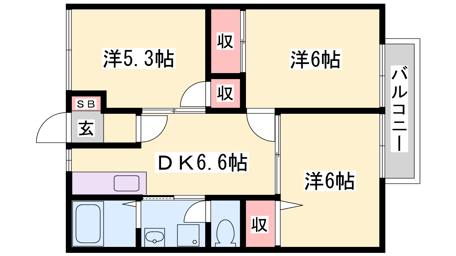 - DK6.6帖、洋室6帖、洋室5.3帖、洋室6帖