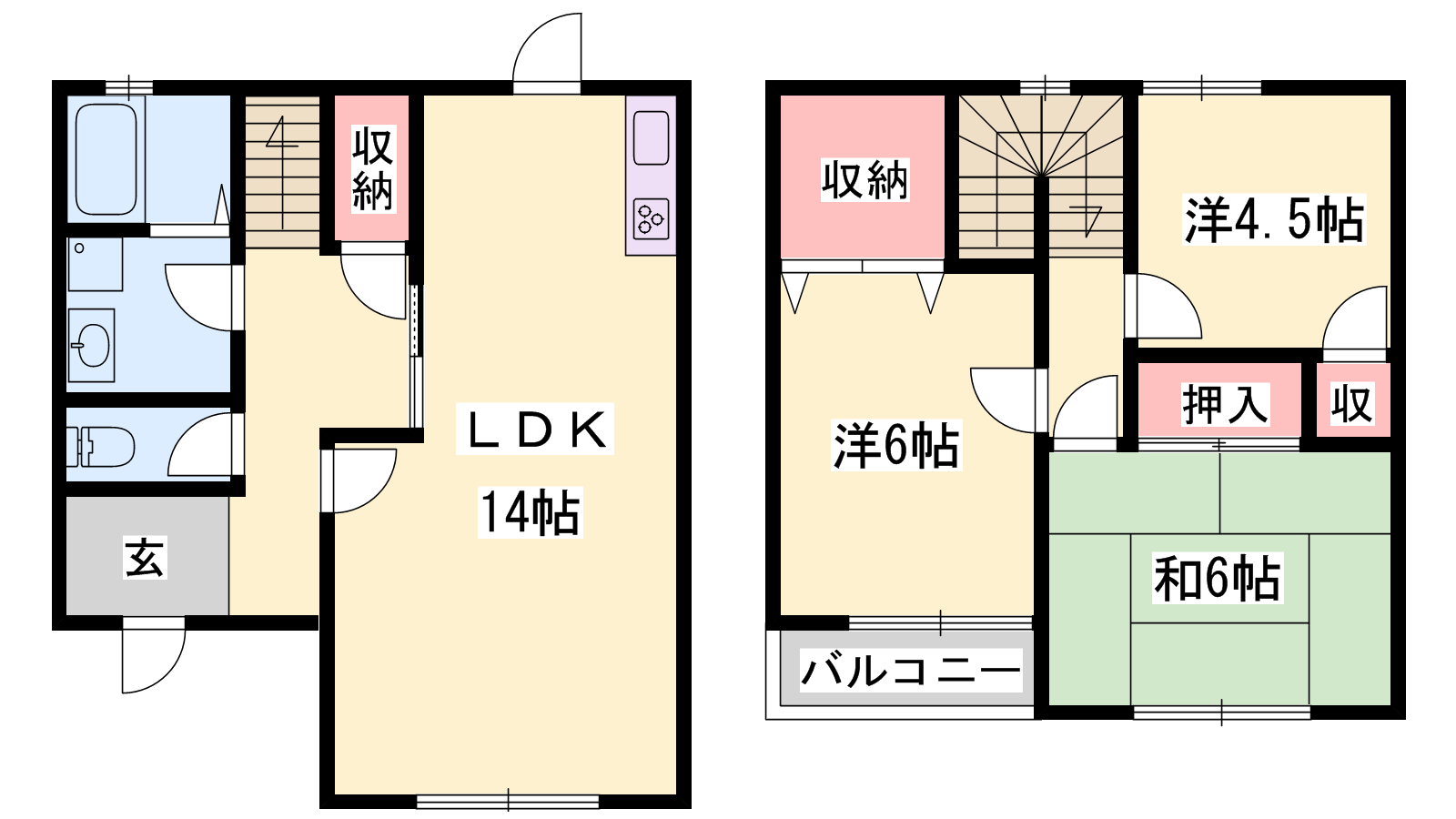 - LDK14帖、洋室6帖、洋室4.5帖、和室6帖