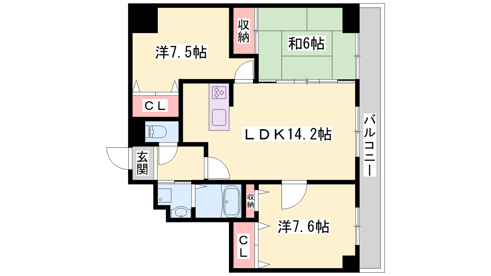 - LDK14.2帖、洋室7.6帖、洋室7.5帖、和室6帖