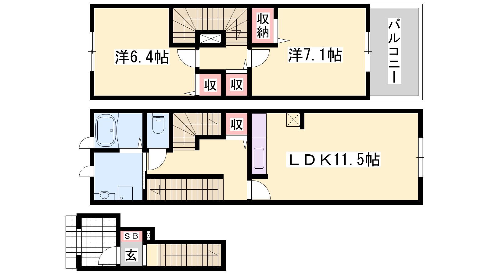 - LDK11.5帖、洋室7.1帖、洋室6.4帖