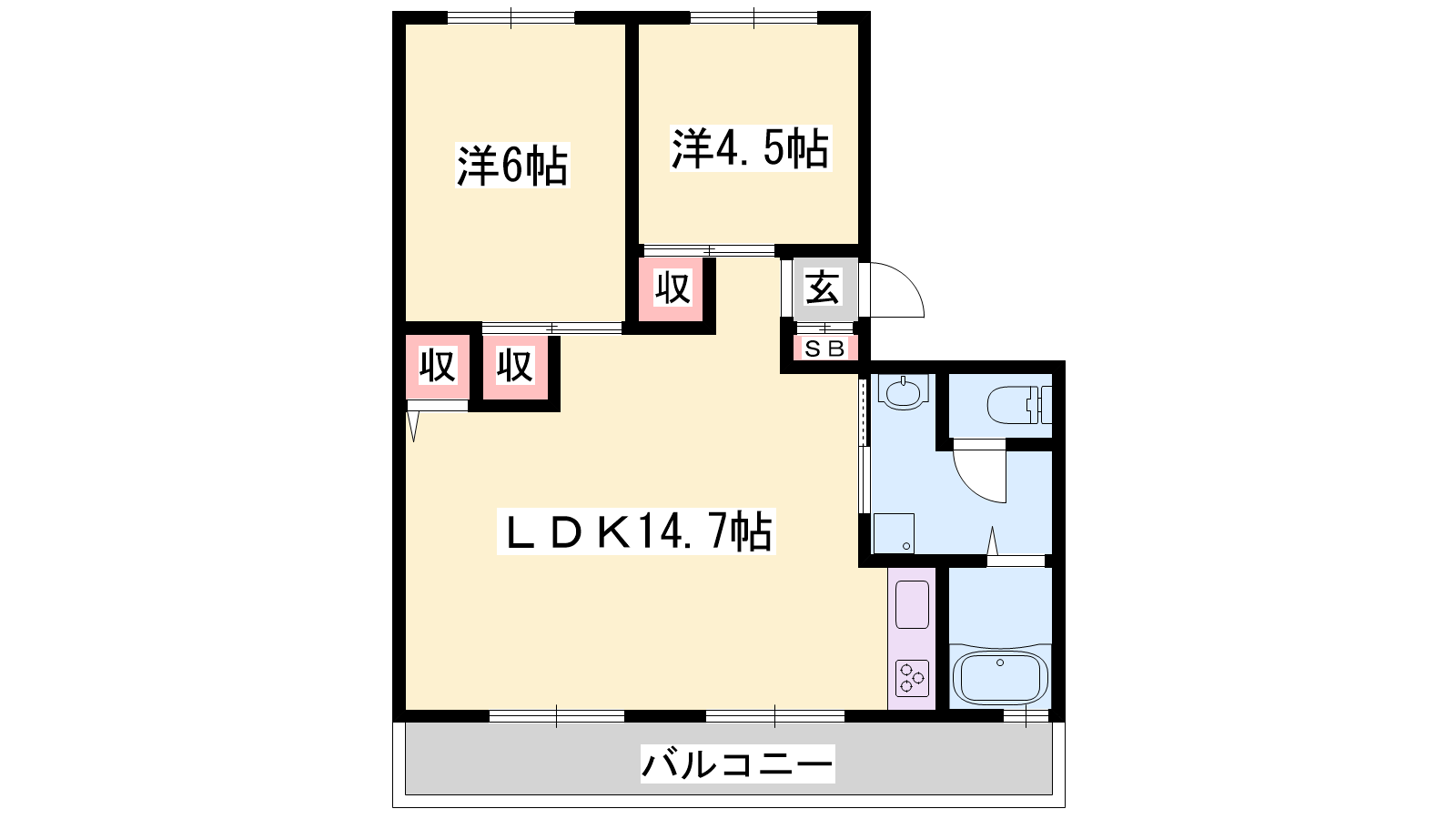 - LDK14.7帖、洋室6帖、和室4.5帖