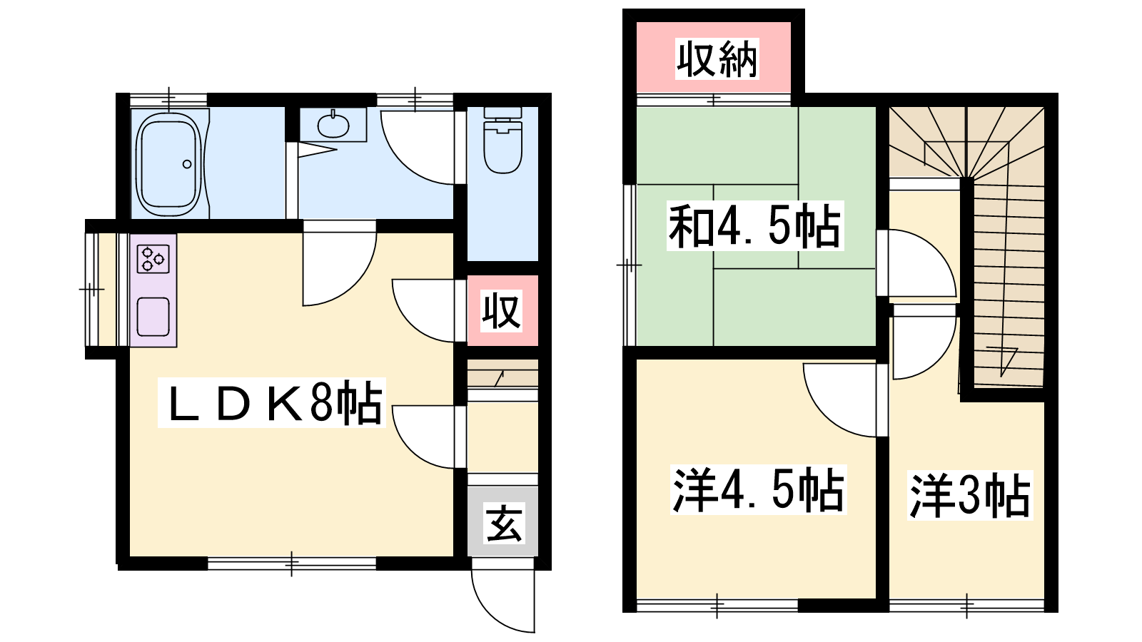 - LDK8帖、洋室4.5帖、洋室3帖、和室4.5帖