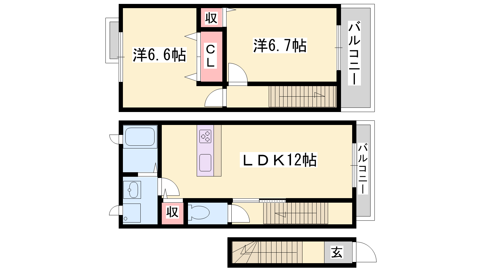 - LDK12帖、洋室6.7帖、洋室6.6帖