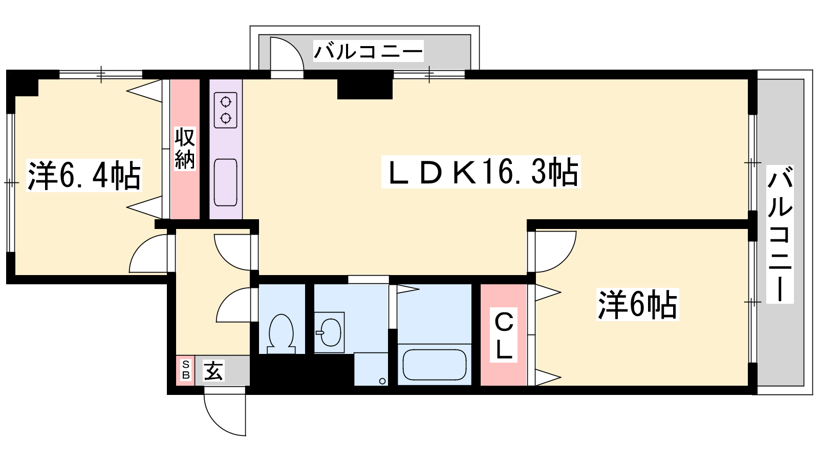 - LDK16.3帖、洋室6.4帖、洋室6帖