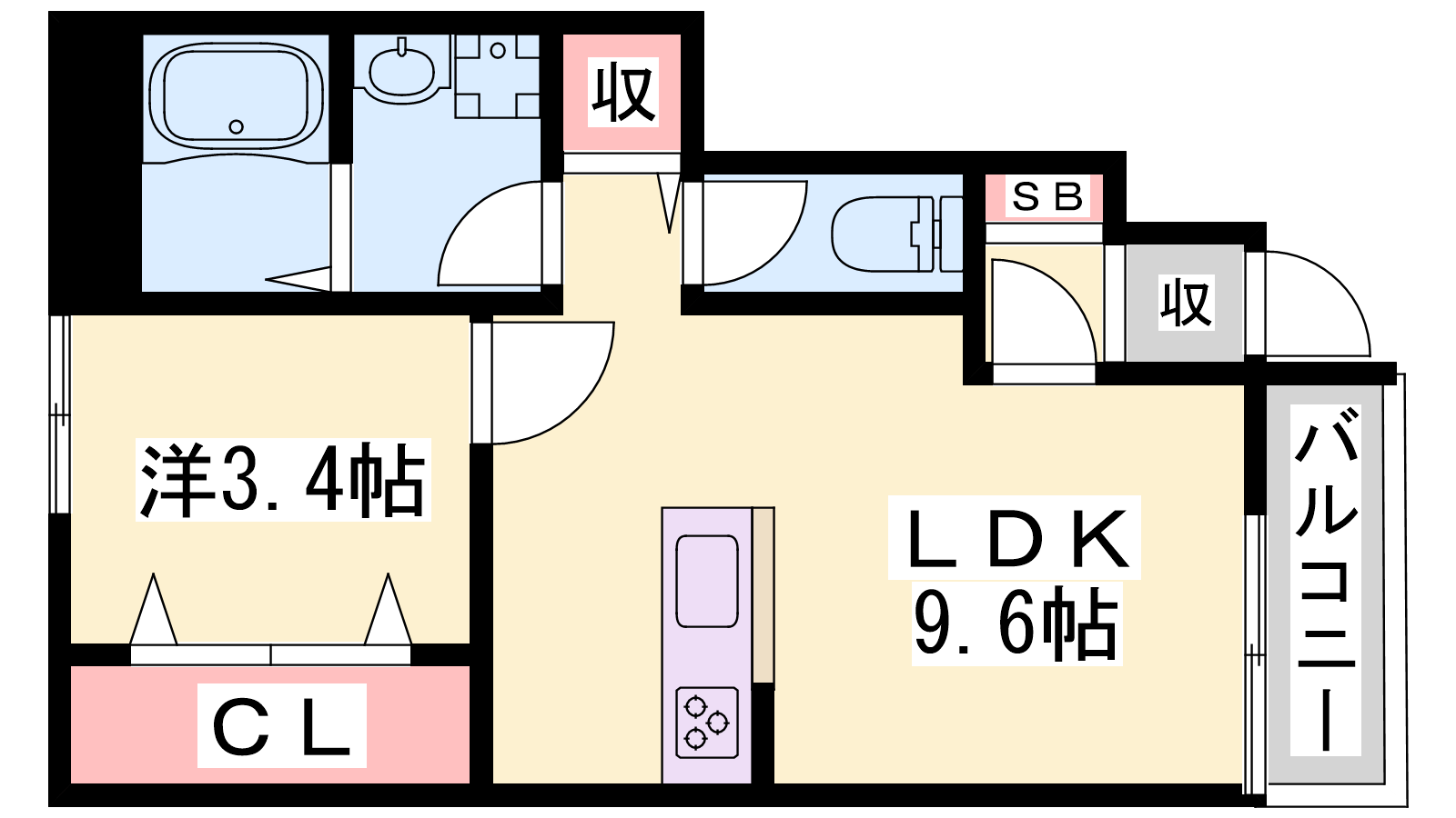 - LDK9.6帖、洋室3.4帖