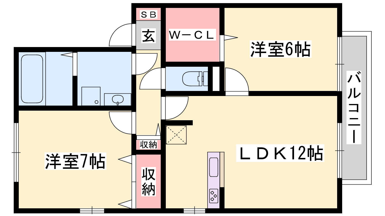 - LDK12帖、洋室7帖、洋室6帖