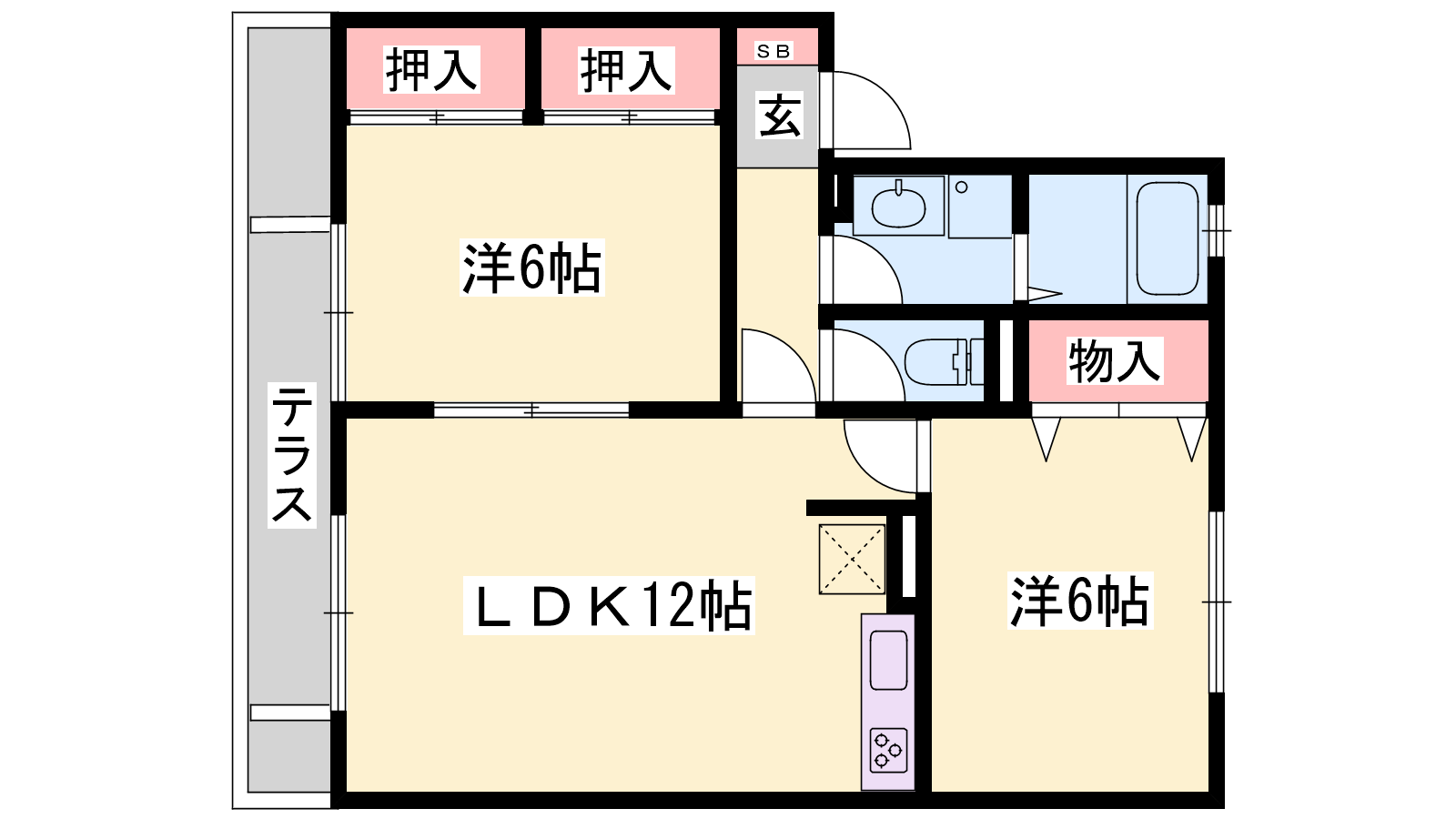 - LDK12帖、洋室6帖、洋室6帖