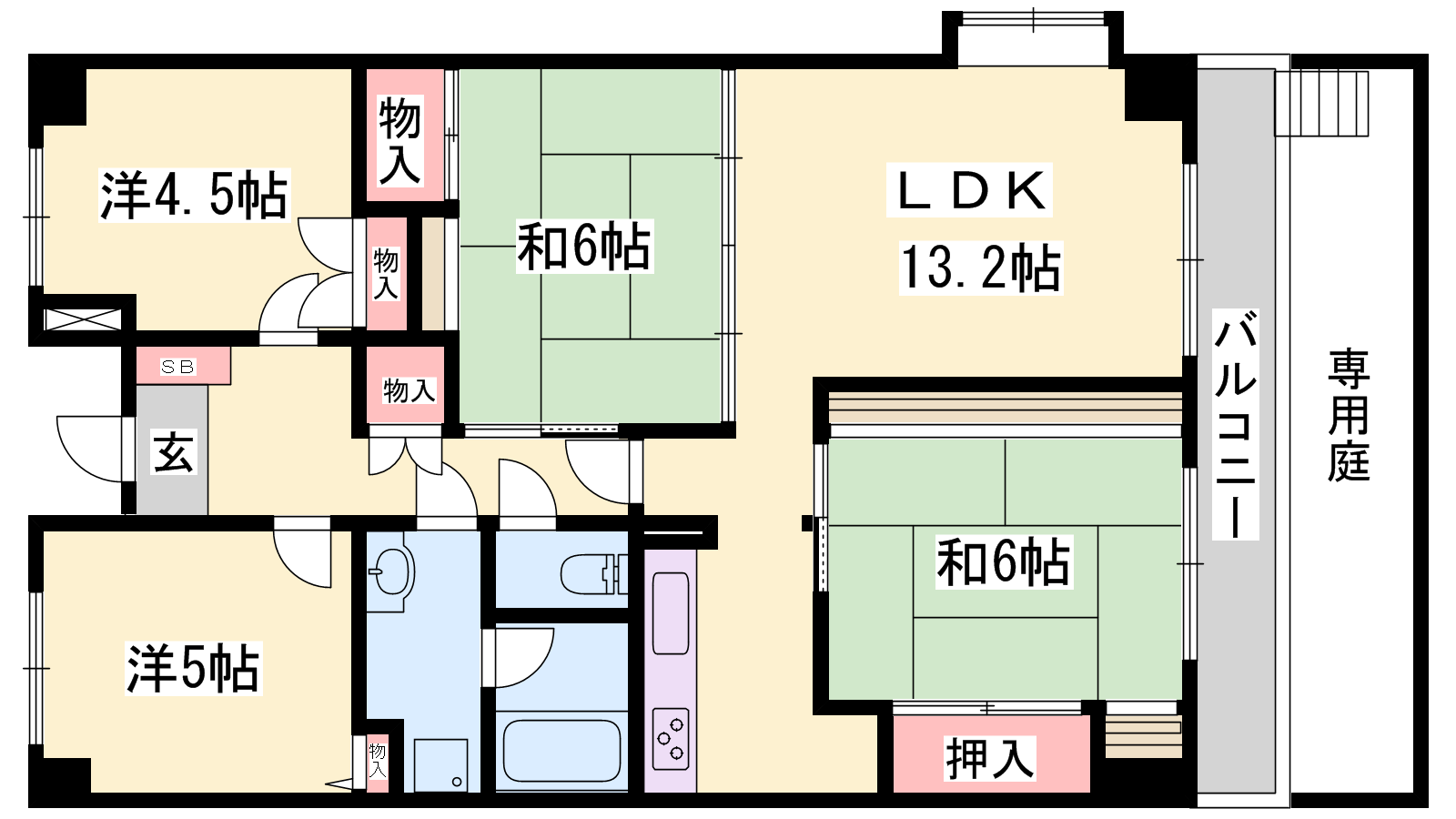 - LDK15帖、洋室5.5帖、和室6帖、和室6帖、洋室4帖
