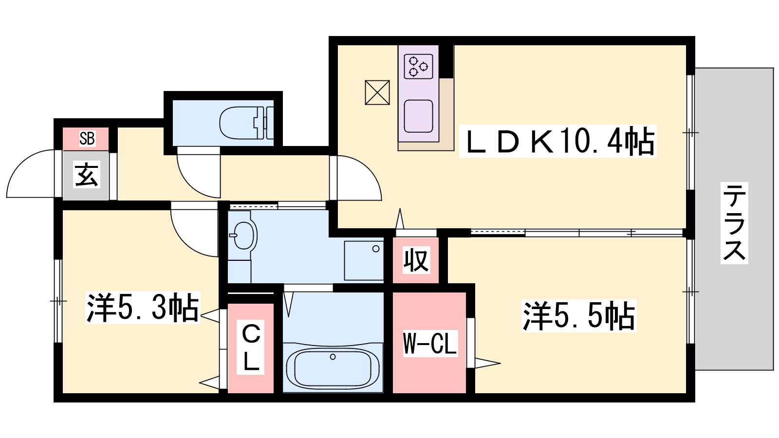 - LDK10.4帖、洋室5.5帖、洋室5.3帖