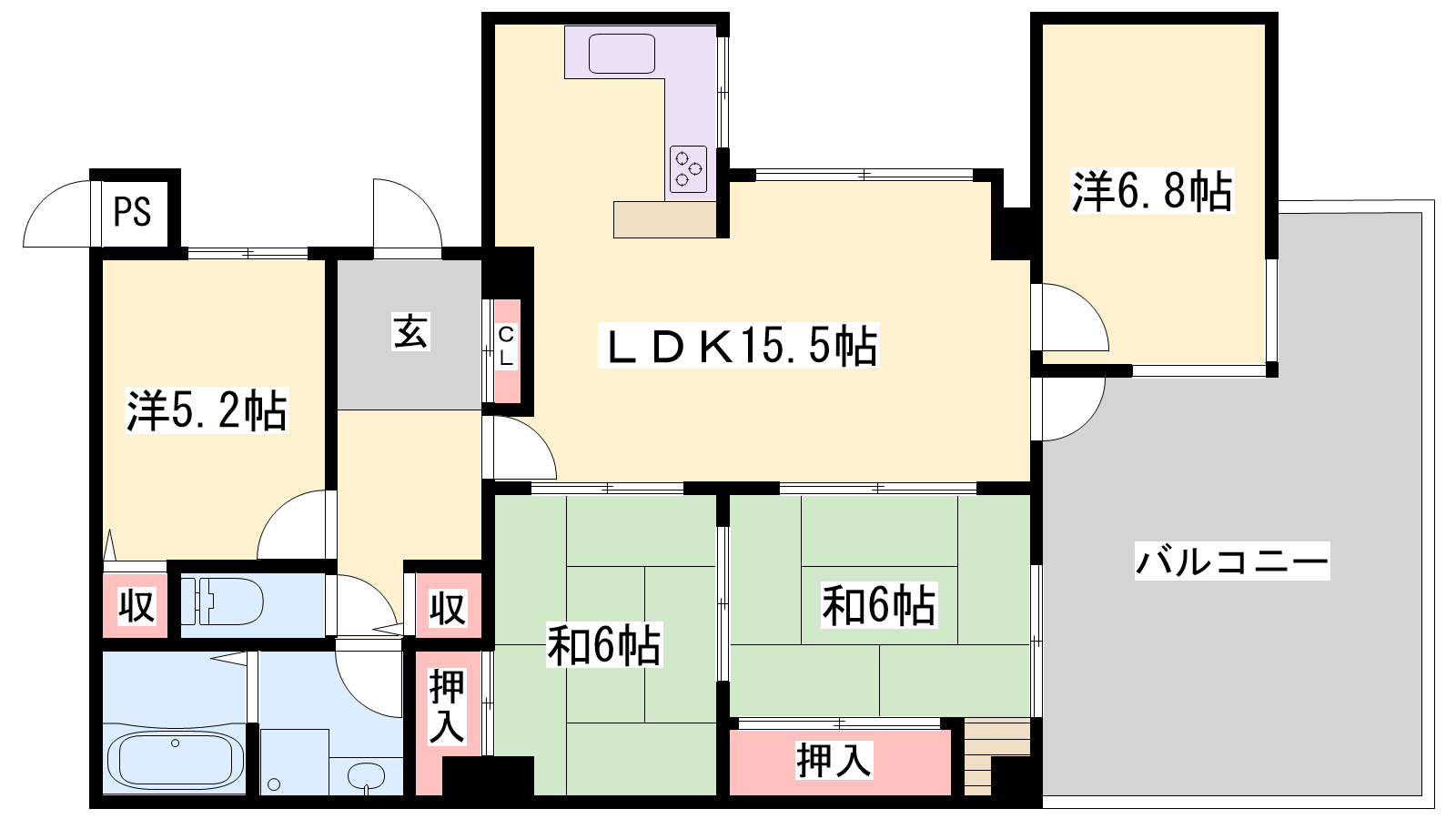 - LDK15.5帖、洋室6.8帖、洋室5.2帖、和室6帖、和室6帖