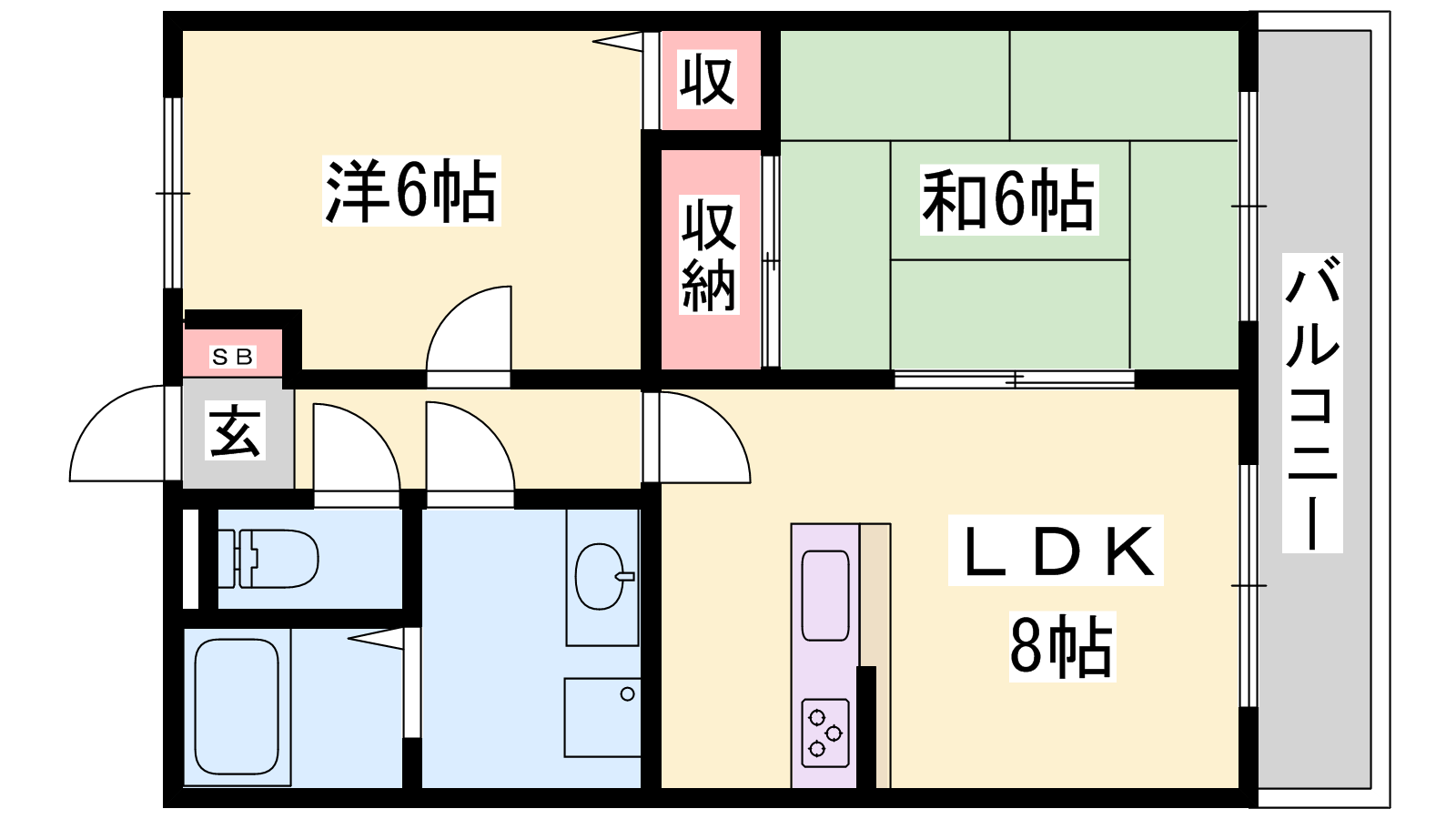 - LDK8帖、洋室6帖、和室6帖