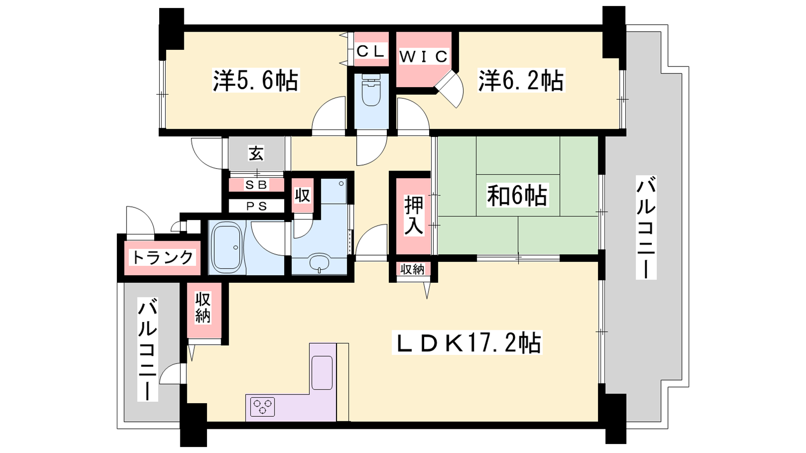 - LDK17.2帖、洋室6.2帖、洋室5.6帖、和室6帖