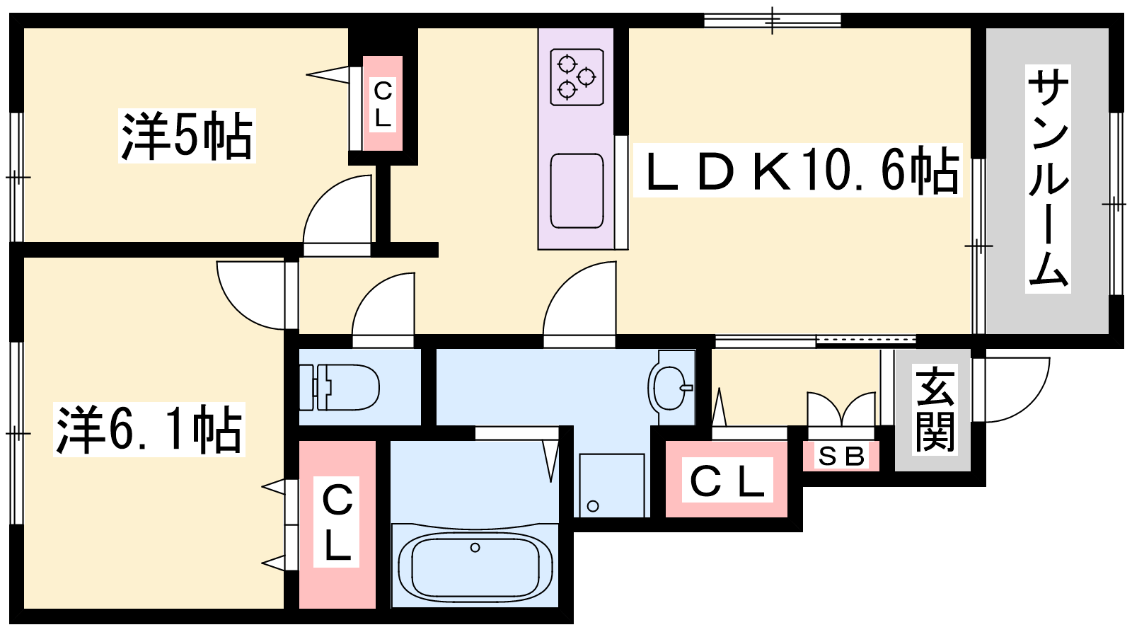 - LDK10.6帖、洋室6.1帖、洋室5帖