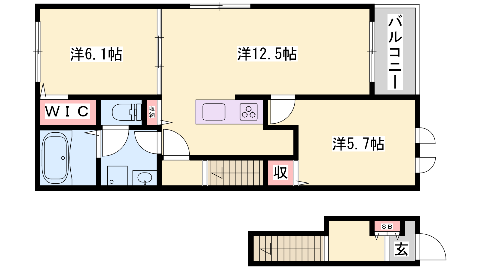- LDK12.5帖、洋室6.1帖、洋室5.7帖