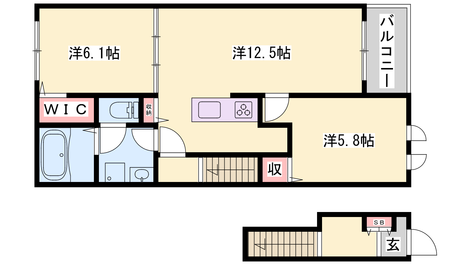 - LDK12.5帖、洋室6.1帖、洋室5.8帖