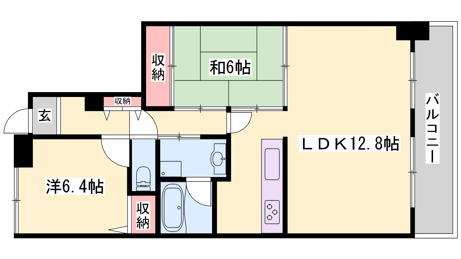 - LDK12.8帖、洋室6.4帖、和室6帖