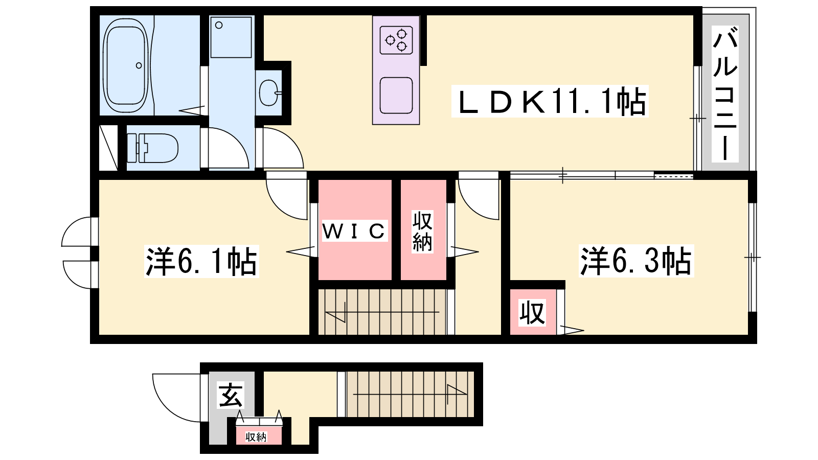 - LDK11.1帖、洋室6.3帖、洋室6.1帖