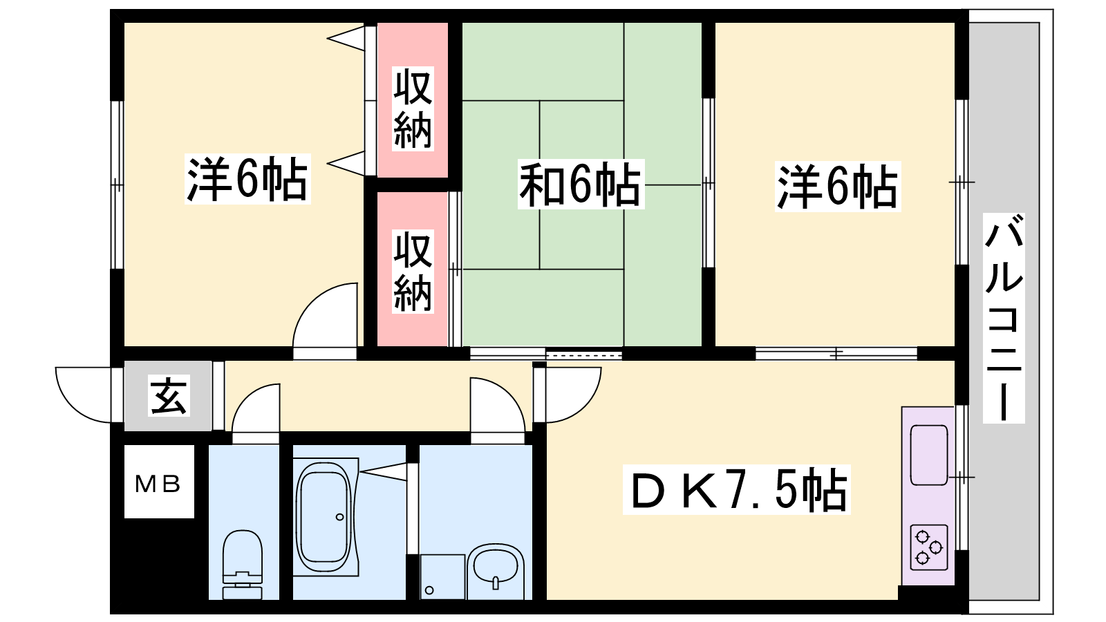- DK7.5帖、洋室6帖、洋室6帖、和室6帖