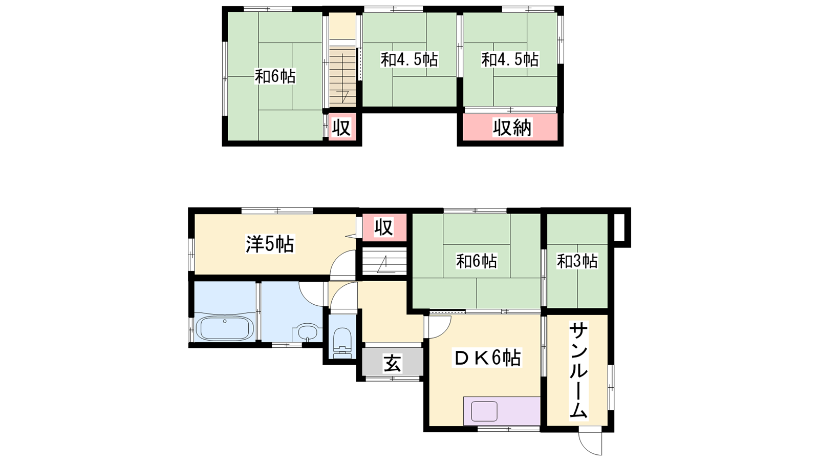 - DK6帖、洋室5帖、和室6帖、和室6帖、和室4.5帖、和室4.5帖、和室3帖