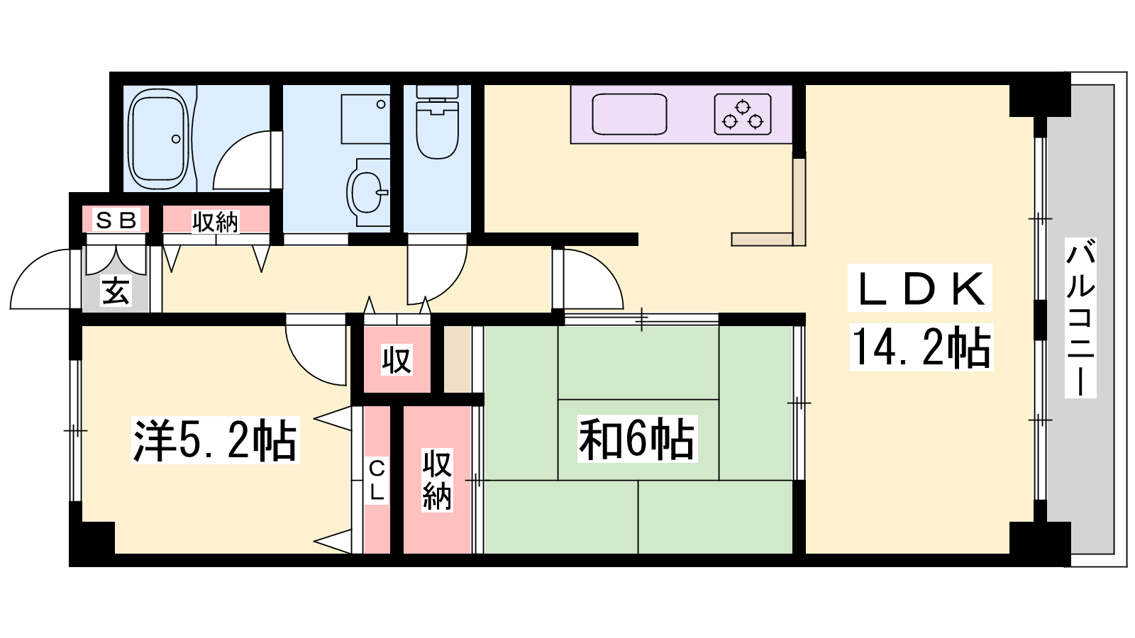 - LDK14.2帖、洋室5.2帖、和室6帖