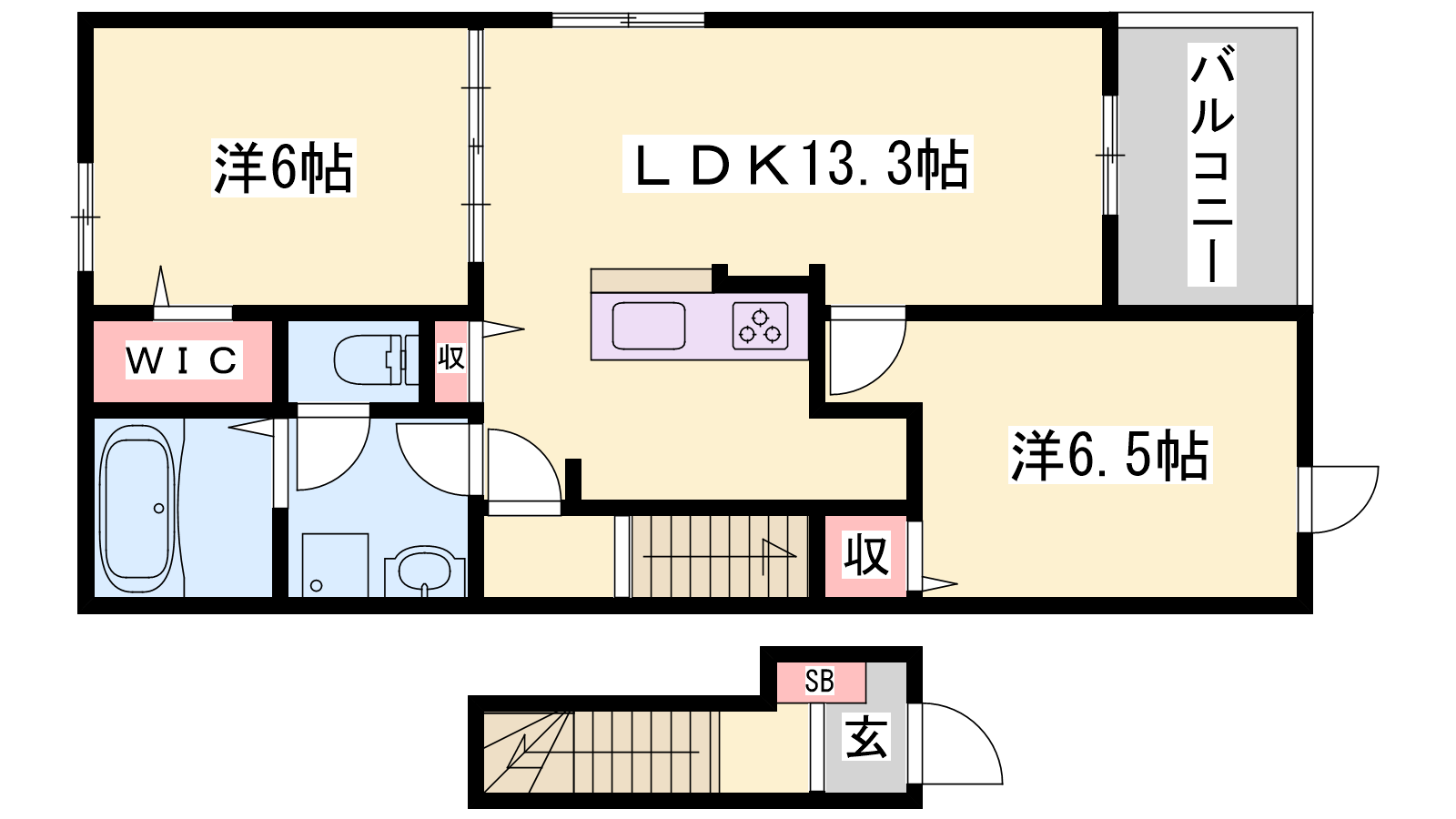 - LDK13.3帖、洋室6.1帖、洋室6.5帖