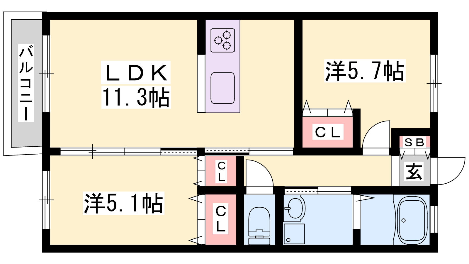 - LDK11.3帖、洋室5.7帖、洋室5.1帖