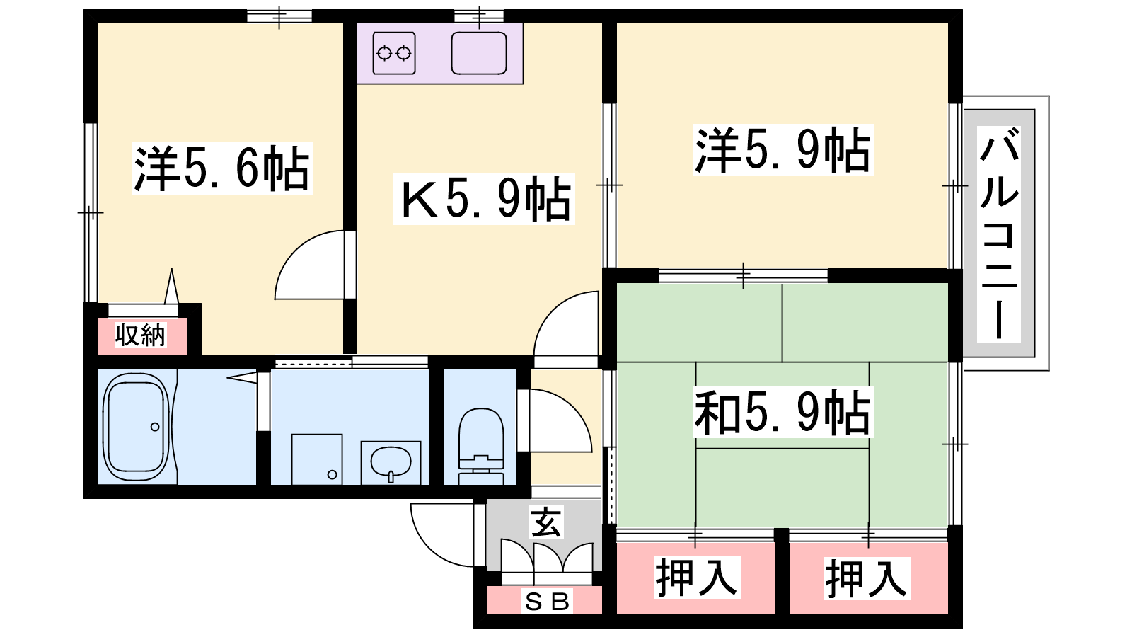 - K5.9帖、洋室5.9帖、洋室5.6帖、和室5.9帖