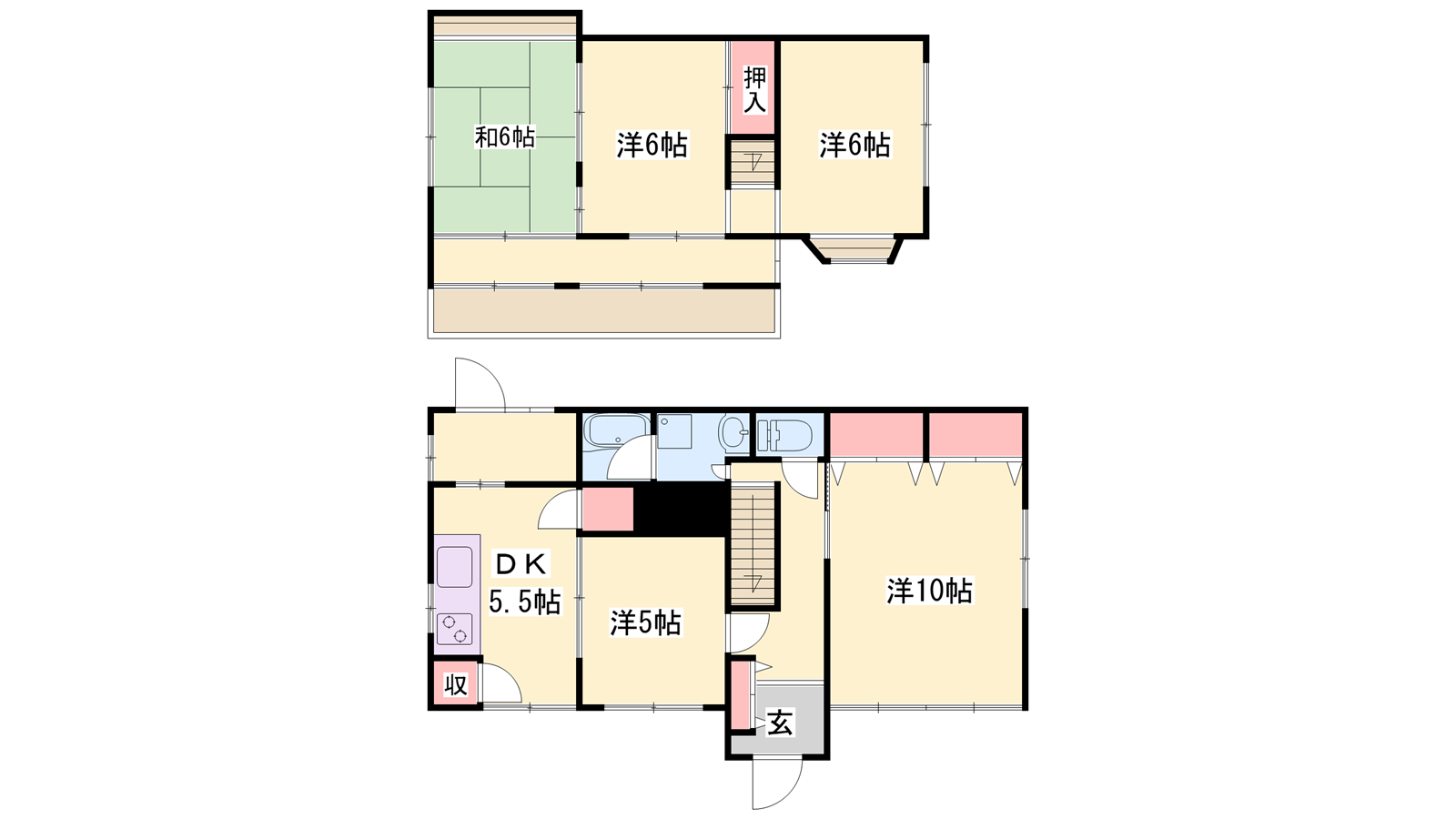 - DK5.5帖、洋室10帖、洋室6帖、洋室6帖、和室6帖、洋室5帖
