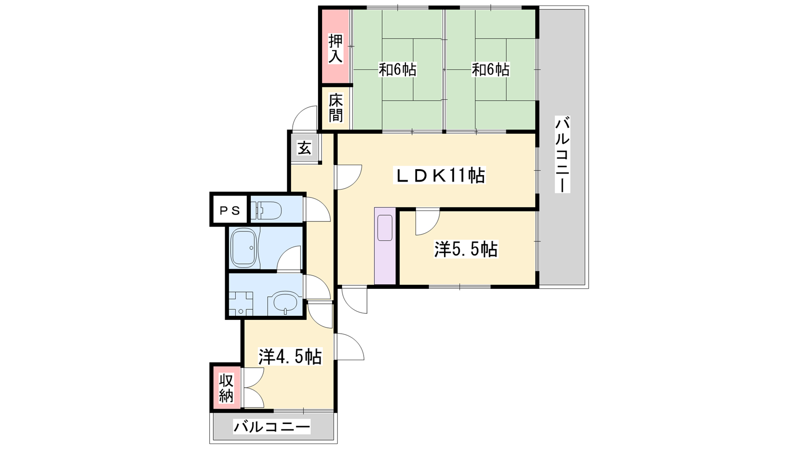 - LDK11帖、洋室5.5帖、洋室4.5帖、和室6帖、和室6帖