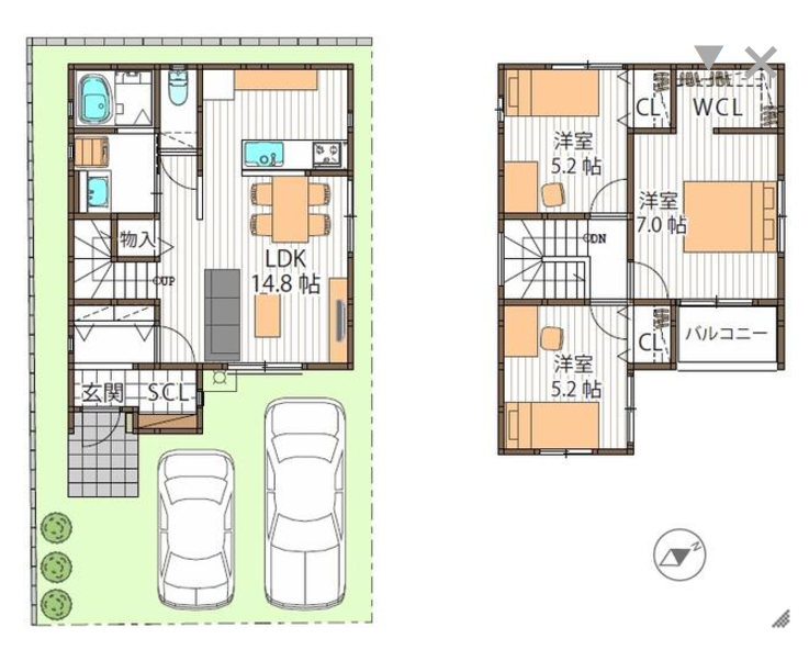 - LDK14.8帖、洋室7帖、洋室5.2帖、洋室5.2帖