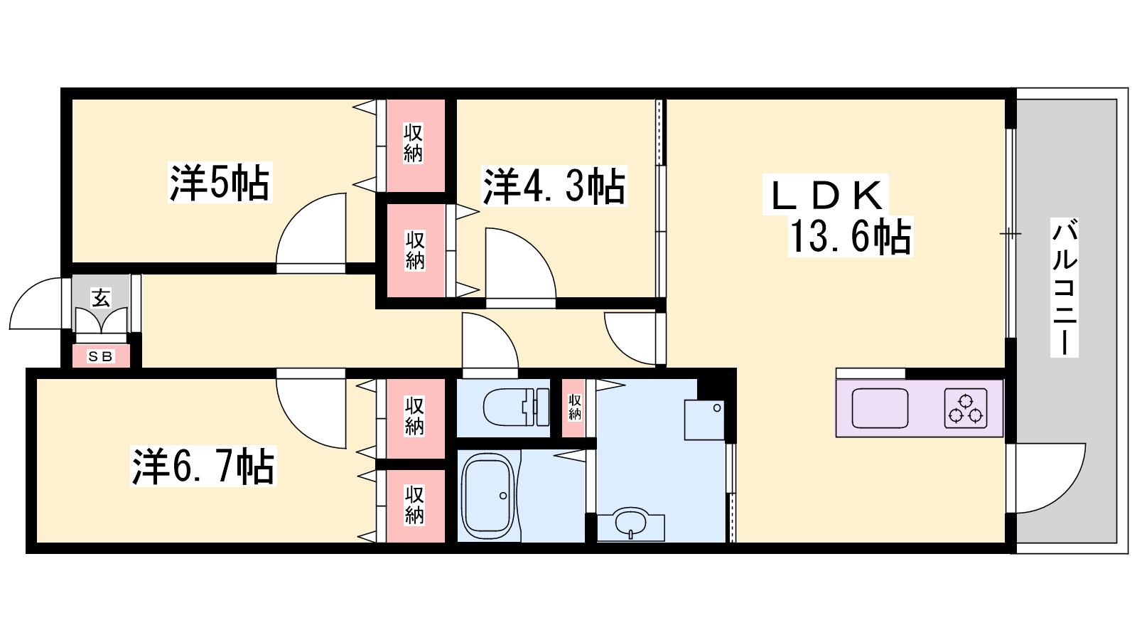- LDK13.6帖、洋室4.3帖、洋室5帖、洋室6.7帖