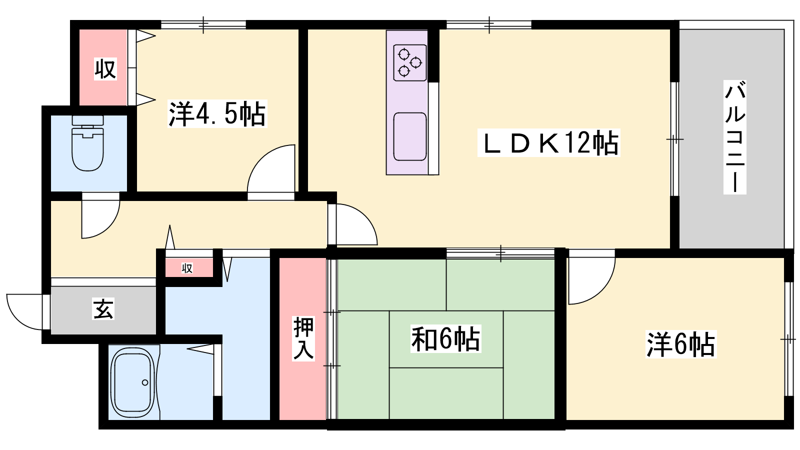 - LDK12帖、洋室6帖、洋室4.5帖、和室6帖